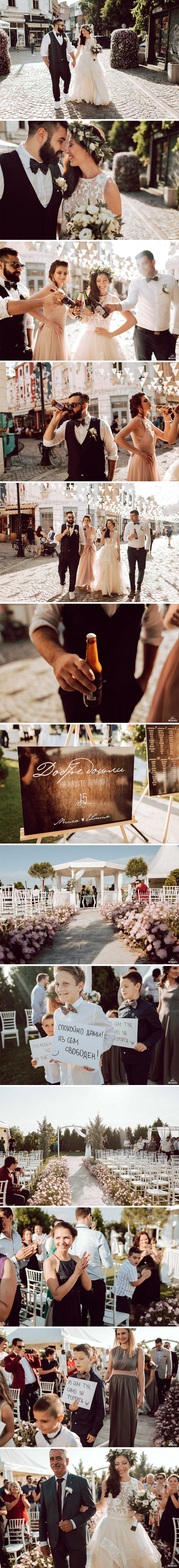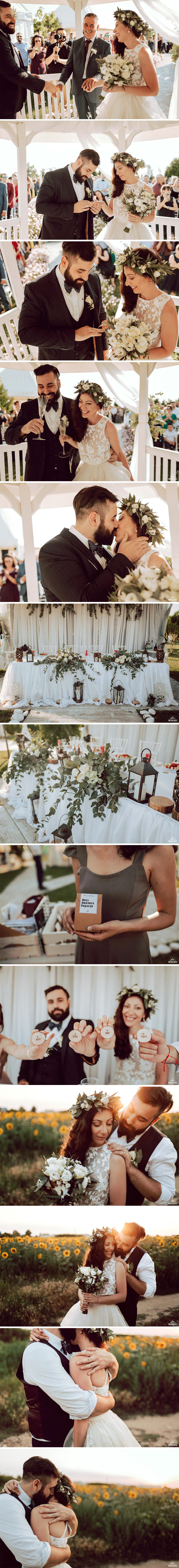 Там направихме една наистина по-разчупена и същевременно яка сватбена фотосесия. Хапнахме сладолед, изпихме по една крафт бира и потеглихме към следващата локация - комплекс Garden Weddings, Пловдив. Комплекса се намира само на броени километри от града и предлага спокойна обстановка, красива зеленина и различни кътчета за снимки. Имат и прекрасен кът за изнесени ритуали, точно като по филмите. След като Мила и Евтим си казаха заветното ,,Да” ,отскочихме до едно красиво слънчогледово поле, където им направих няколко зашеметяващи снимки по залез слънце. Веднага след тази кратка сватбена сесия влезнахме в комплекса и се започна с щурото и весело сватбено парти.